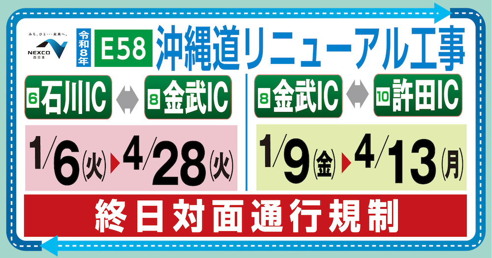 1月9日(金)から金武IC~許田ICで、終日対面通行規制を行います。